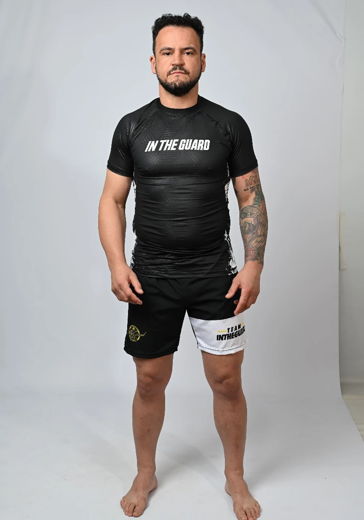 Estampa e identidade In The Guard: Aplicação da logomarca no peito e mangas, trazendo estilo e identidade para o treino.